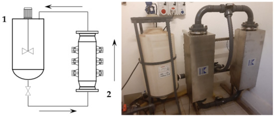First, 2 kg of sieved grape stalks (<1000 µm) were mixed with water at 45 °C to reach the desired S/L ratio of 1:30, for a total addition of 60 L. The pump speed was set to 300 rpm, resulting in a flow rate of 30 L/min. The recirculated solution entered the middle section of the tank, and thus provided additional suspension mixing together with the blade mixer. The tank acted as a 45 L buffer while 15 L were processed. The ultrasonic reactor BioPush Weber, with a generator input power of 2000 W, was used for all of the S-UAE, thus allowing for an automatic time control to be set. Then, 50–100 mL of samples were collected at fixed times. A schematic representation and relative picture can be found in Figure 1.