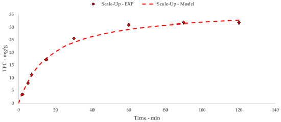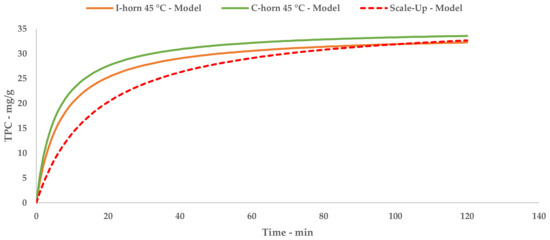 The obtained hyperbolic curve describes a time-dependent extraction trend. This model is useful to display the horizontal asymptote of Ys and the extraction rates (slope of the curve). Furthermore, the so-called “knee-point” can be exploited to determine the best trade-off between productivity and the process extent. This graphical feature can be identified where the extraction efficiency starts to steeply increase and it no longer worth the time consumption. In the present work, the abovementioned parameter could not be directly applied because of the necessary technological transposition (see Section 3.5).