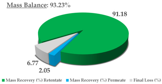 The crude extract recovered from S-UAE amounted to approximately 100 L, and was processed by NF performed on a HARI P2B200-400 membrane skid (HydroAir Research, Lodi, Italy) that was equipped with a DLU 19 F cartridge (2.5 m2) with an approximative MWCO (molecular weight cut-off) span of 150–300 Da. The flow rate was set to 1000 L/h by means of a by-pass and counter-pressure regulation. The latter was raised to 10 bar and maintained until a constant output was observed. Once the residual volume reached 40 L, the pressure was increased to 15 bar for the remaining time. The temperature was monitored, and ranged from 25 to 30 °C. The process was concluded when precipitation due to solvent removal was incipient, at a residual volume of roughly 20 L. The concentrated fraction corresponded to the retentate stream, continuously recycled into the feed tank, while the removed aqueous solution converged into the permeate output. The retentate was collected during the process and the dry extract (DE) yield was derived by freeze drying. The NF trend was defined by the percentage global concentration (GConc) and instant concentration (InstConc). GConc considered t = 0 dry yield as a reference, while InstConc provided a ratio between two adjacent samples. An aliquot of the permeate was also freeze dried so as to determine the mass balance.