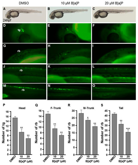 Developmental neurotoxicity of B[a]P revealed by the Tg(elavl3:EGFP) model. Tg(elavl3:EGFP) zebrafish embryos received the indicated treatments: 0 μM. (control, 01% DMSO; (A,C,F,I,L)), 10-μM B[a]P (B,D,G,J,M) and 20-μM B[a]P (C,E,H,K,N). (A–C) Lateral view of the live embryos at 24 hpf after treatment with 0.1% DMSO (control; A), 10-μM B[a]P (B) and 20-μM B[a]P (C); (D–O) Effects of B[a]P on neurogenesis using the Tg(elavl3:EGFP) model. The embryos treated with 0.1% DMSO (control; (D,G,J,M)), 10-μM B[a]P (E,H,K,N) and 20-μM B[a]P (F,I,L,O) were collected at 24 hpf. Representative fluorescent images are shown for embryonic trigeminal ganglions (tg) in the head region (D–F) and Rohon–Beard cell (rb) in the front trunk (G–I), mid-trunk (J–L) and in tail regions (M–O). (P–S) The numbers of tg cells in the head region and rb cells in front-trunk (F-trunk), mid-trunk (M-Trunk) and tail were counted from 10 embryos in each treatment group. Data are shown as mean ± standard deviation. * p < 0.05, ** p < 0.01, *** p < 0.001 compared with the control.