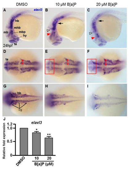 B[a]P-treated embryos exhibit defective nervous system development. In situ hybridization staining was performed with a riboprobe against elavl3, a marker gene specifically expressed in telencephalon (te), hypothalamus (hy), midbrain (mb), midbrain hindbrain boundary (mhb) and plate (mhp) and hindbrain (hb) of the developing brain (A). (A–I) Zebrafish embryos exposed to 0 μM. (control, 01% DMSO), 10-μM B[a]P and 20-μM B[a]P were analyzed at 24 hpf. Embryos in (A–C) are shown from the lateral view; the red arrowheads indicate developmental defects in the midbrain (mb), and the hollow arrowheads indicate developmental defects in midbrain-hindbrain boundary (mhb); (D–F) Embryos are shown from the lateral view. The developing telencephalon (te; rectangles in (E,F)) was wider and the expression of elavl3 was weaker than in the control embryos; (G–I) Images are focused on the hindbrain (hb) region. The development of cranial ganglia (cg) was dose-dependently affected by B[a]P treatment; (J) Expression alteration of elavl3 in B[a]P was quantified by real-time quantitative RT–PCR (* p < 0.05, ** p < 0.01 compared with the control).