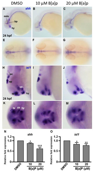 Expression patterns of shh and isl1 are dose-dependently affected by B[a]P exposure. Wild-type (AB) zebrafish embryos were treated with 0 μM. (control, 01% DMSO), 10-μM B[a]P and 20-μM B[a]P. The embryos were fixed at 24 hpf. Expression of shh (A–G) and isl1 (H–M) was analyzed by in situ hybridization staining. Images show the lateral view in (A–C,H–J). Images in (E–G) show the dorsal view. Images in (K–M) show the frontal view; (B,C) Expression of shh was specifically expressed in the mid-diencephalic organizer (mdo), hypothalamus (hy) and basal plate (bp) of B[a]P-treated embryos; (E–G) The expression pattern of shh in the brain and floor plate (fp) in 20-μM B[a]P-treated embryos; (H–M) The development of encephalic regions was examined by in situ hybridization staining by probing for the islet1 gene (isl1) which is specifically expressed in telencephalon (te), ventral thalamus (vp), hypothalamus (hy), epiphysis (ep) and posterior commissure (pc) in embryos at 24 hpf. (N, O) Expression alteration of shh and isl1 in B[a]P was quantified by real-time quantitative RT–PCR (* p < 0.05, ** p < 0.01, ***p < 0.001 compared with the control).
