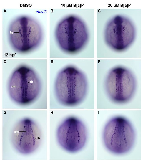 To determine the embryonic timing at which B[a]P begins to affect the developing neural system, we performed in situ hybridization staining with an elavl3 riboprobe in embryos at 12 hpf. At this time point, elavl3 is expressed in cranial trigeminal ganglions cells, primary motor neurons and Rohon–Beard cells (Figure 4A,D,G). Based on the staining results, no obvious effects of B[a]P exposure could be observed on trigeminal cranial ganglion cells in the head region (Figure 4A–C) or in primary motor neurons and Rohon–Beard cells (Figure 4D–I). These observations suggest that the neurotoxic effects of B[a]P are not present at 12 hpf, suggesting that the window of vulnerability begins at later stages.