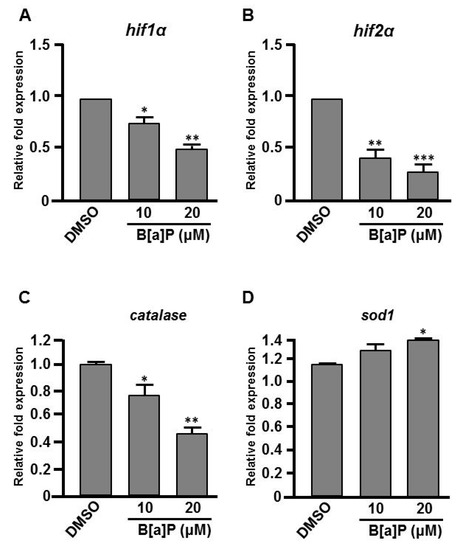 Expression levels of Hifs and oxidative stress-related genes are altered in B[a]P treated embryos. Zebrafish embryos were exposed to 0 μM. (control, 01% DMSO), 10 and 20 μM of B[a]P from 2 hpf until 24 hpf. Expression of genes encoding (A) Hif1α, (B) Hif2α, (C) Catalase and (D)Sod1 was examined by real-time quantitative RT–PCR. * p < 0.05, ** p < 0.01, *** p < 0.001 compared with the control.