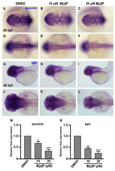 Expression levels of Survivin and Epo genes are reduced in B[a]P treated embryos. Zebrafish were exposed to 0 μM (control, 01% DMSO), 10 and 20 μM of B[a]P from 2 hpf until 24 hpf. Whole-mount in situ hybridization staining was performed with riboprobes against survivin (A–F) and epo (G–L) at 24 hpf. The staining levels of survivin (M) and epo (N) were quantified. * p < 0.05, ** p < 0.01, *** p < 0.001 compared to control.