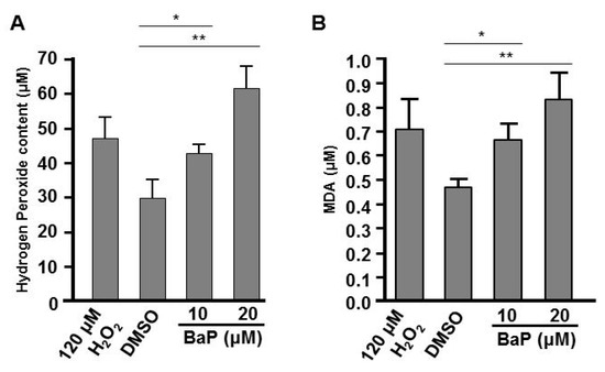 3.4. Exposure to B[a]P Increases Hydrogen Peroxide and Lipid Peroxidation