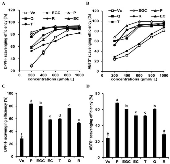 | ABTS+ scavenging efficiency | P (+) > EC (-) | EGC (+) > EC (-) | Q (+) > T (-) | Q (-) > R (+) |