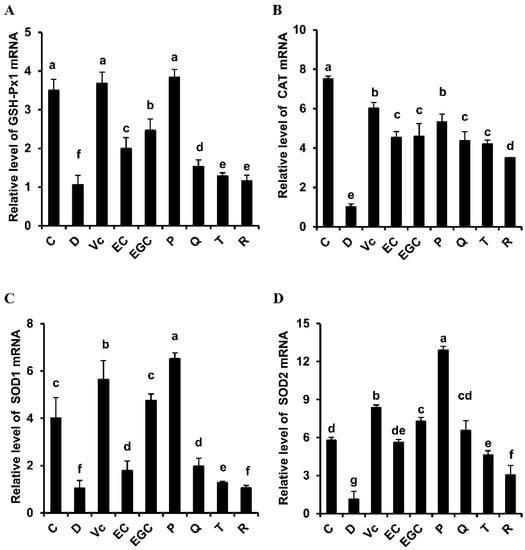 | Hepatic CAT mRNA | P (+) > EC (-) | EGC (+) ≈ EC (-) | Q (+) ≈ T (-) | Q (-) > R (+) |