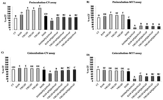 Effects of pre- or co-incubation with different mung bean extracts on viability and metabolic status of HT-29 cells treated or not with peroxynitrite. (A) preincubation crystal violet viability assay, (B) preincubation MTT metabolic status assay, (C) coincubation crystal violet viability assay, (D) coincubation MTT metabolic status assay. Results are represented as means ± SEM. Superscripts when different indicate p < 0.05. CT, control. RAW, raw Vigna radiata. VRG2D, 2d-germinated Vigna radiata. VRG3D, 3d-germinated Vigna radiata. VRG4D, 4d-germinated Vigna radiata. EtOH, ethanol. EtOH&PQ&SNAP, ethanol plus PQ/SNAP. RAW&PQ&SNAP, raw Vigna radiata plus PQ/SNAP. VRG2D&PQ&SNAP, 2d-germinated Vigna radiata plus PQ/SNAP. VRG3D&PQ&SNAP, 3d-germinated Vigna radiata plus PQ/SNAP. VRG4D&PQ&SNAP, 4d-germinated Vigna radiata plus PQ/SNAP. PQ, Paraquat. SNAP, S-nitroso-N-acetylpenicillamine.