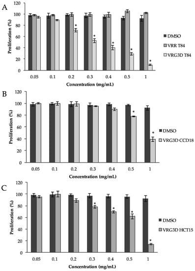 Antiproliferative in vitro studies were performed using raw and 3-day-germinated mung bean extracts in a T-84 cell line (Figure 5). No cytotoxic effects were found in the T-84 cell line with VRR at the concentrations tested. However, a significant cytotoxic effect was found on this cell line after incubation with increasing concentrations of VRG3D extract (Figure 5A), obtaining an IC50 of 0.33 ± 0.02 mg·mL−1. In Figure 5B, a three-fold greater IC50 value of CCD-18 (0.86 ± 0.04 mg·mL−1) compared to the T-84 cell line indicates that that this compound can be more aggressive against tumor cells than non-tumor cells. In the case of the HCT-15 cell line, a drug-resistant cell line, the obtained IC50 value (0.61 ± 0.02 mg·mL−1) is situated in between the ones obtained for the other cell lines, due to the characteristic drug-resistance of this cell line (Figure 5C).