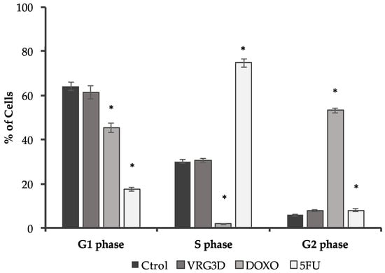 Modulation of cell cycle analysis by 3d-germinated mung bean extract in T-84 cell line. FACS scan analysis results were expressed as the percentage of labelled cells in each cell cycle phase. Results are represented as means ± SEM. CTROL, no treatment; DOXO, Doxorrubicin; 5FU, 5 Fluorouracil; VRG3D, 3d-germinated Vigna radiata. * indicates a significance of p < 0.05 between the treatment and control.