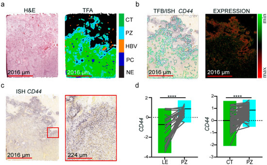 Hypoxia-related gene signature distinguishes between different anatomic features of glioblastoma: (a) representative hematoxylin and eosin (H&E) staining section from tumor W5-1-1-L.1.05 (left panel), converted to tumor feature anatomic (TFA) color map (right panel). Color code: green—cellular tumor (CT); light blue—perinecrotic zone (PZ); orange—hyperplastic blood vessels (HBV); purple—infiltrating tumor (IT); dark blue—pseudopalisading cells (PC); black—necrosis (NE); (b) representative section labeled using ISH probe against CD44 gene with merged tumor feature boundary (TFB) of anatomic regions (left panel), and ISH-labeled CD44 signal converted to fluorescent map (right panel); (c) representative section labeled using ISH probe against CD44 gene (left panel) with red inset indicating a site of magnification; (d) RNA-seq expression data of CD44 (z-score values as in Table S1) in anatomic features LE (n = 43), CT (n = 111), and PZ (n = 66) isolated by LMD; paired two-tailed t-test, p-value between pairs (n = 23 for LE vs. PZ, and n = 65 for CT vs. PZ) is shown; **** p < 0.0001.