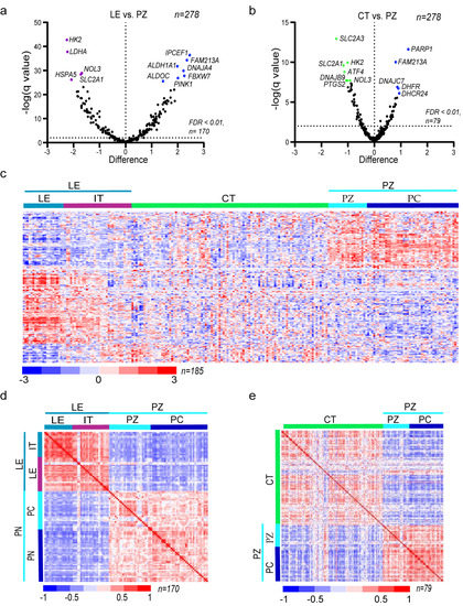 Oxidative stress-related gene expression patterns differ between anatomic features of glioblastoma: (a,b) volcano plots representing differentially expressed genes between LE vs. PZ (pink—genes downregulated, blue—upregulated in LE) (a), and CT vs. PZ (green—genes downregulated and, blue—upregulated in CT) (b), each dot corresponds to one gene (n = 278), the horizontal dotted line shows a cutoff for FDR < 0.01; (c) hierarchical clustering of 185 genes found as statistically differentially expressed between LE, CT vs. PZ in all anatomic features of glioblastoma; rows and columns represent genes and samples, respectively. Colors correspond to the expression level of detected genes, and the blue–red scale bar indicates expression level, with blue being the lowest and red the highest; (d,e) a correlation matrix showing correlation coefficients between gene expression in LE vs. PZ (n = 170; Pearson r = −0.407) (d), and CT vs. PZ (n = 79; Pearson r = −0.09) (e); blue–red bar scale indicates correlation coefficients level, with blue being the negative and red positive correlation.