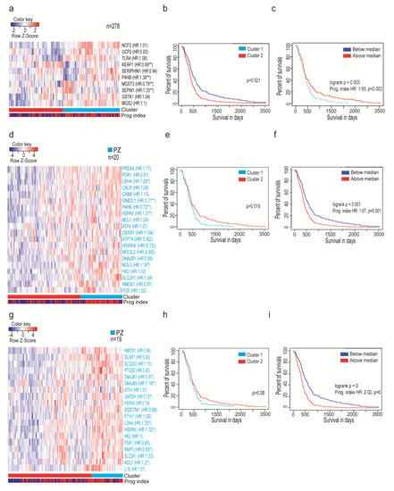 Patient survival is correlated with the expression of oxidative-stress-related genes in the perinecrotic zone: (a,d,g) Heatmaps with color annotations according to profile similarity (light blue/red) annotated with prognostic index (red–dark blue). (b,c,e,f,h,i) Kaplan–Meier analysis of a full cohort of glioblastoma. Clustering and survival analysis of samples dataset stratified by the status of oxidative stress response genes (a–c), top-20 upregulated genes in PZ vs. LE (d–f), or vs. CT (g–i).