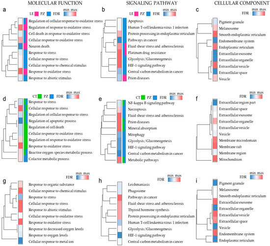 Gene Ontology analysis reveals activation of distinct pathways in diverse anatomic features of glioblastoma: Function of top-20 (a–f) and 29 outcome predictive gens (g–i) represented as Gene Ontology tree in indicated categories. Color bars (a,b,d,e) represent an enrichment of upregulated genes from different anatomic tumor features (LE-pink, CT-green, PZ-blue), a single-color square indicates activation of unique pathways, and a two-color square indicates shared pathways. FDR values are shown as a heat map, with red maxim and blue minimum.