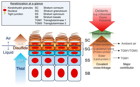 Keratinization at a glance. A thiol (-SH) gradient through the epidermis provides unparalleled cytoprotection. Following a microenvironmental rise in Ca2+, TGMs catalyze ε-(γ-glutamyl) lysine (protein-protein) cross-linkages and ester (lipid-protein) cross-linkages above the SS. Upon exposure to the ambient air, the keratinocyte cytoskeleton undergoes extensive disulfide formation in the SG and stabilizes corneocytes.