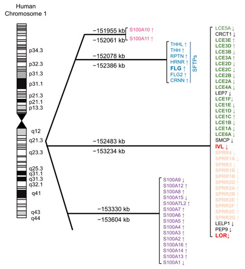 - Mischke, D.; Korge, B.P.; Marenholz, I.; Volz, A.; Ziegler, A. Genes encoding structural proteins of epidermal cornification and S100 calcium-binding proteins form a gene complex (“epidermal differentiation complex”) on human chromosome 1q21. J. Investig. Dermatol 1996, 106, 989–992. [Google Scholar] [CrossRef] [PubMed]