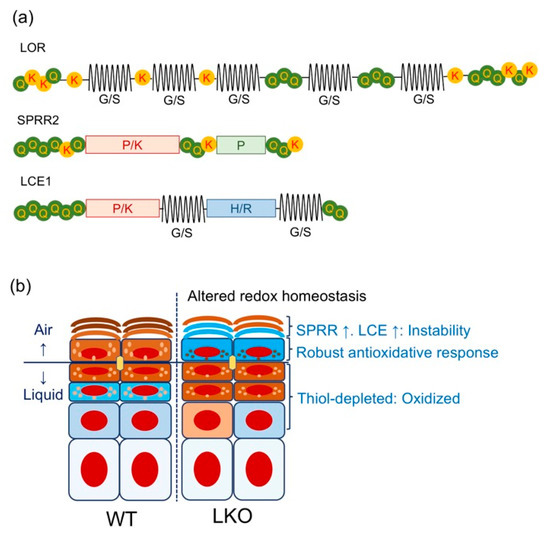(a) The primary structure of murine LOR, SPRR2, and LCE1. LOR is a major CE component that contains high amounts of glycine (G; 55%), serine (S; 22%), and cysteine (C; 7%) arranged in tandem peptide quasi-repeats. These repeats are separated by highly conserved lysine (K) and glutamine (Q) residues that are substrates for transglutaminase-mediated ε-(γ-glutamyl) lysine cross-linkage. The consensus sequence of the SPRR2 family comprises almost entirely of proline (P), Q, K, and C. The consensus sequence of the LCE1 family suggests high amounts of P (~12%), as well as G (~20%) and S (~25%), suggesting that LCE1s have evolved as hybrids between LOR and SPRR2s. The H/R-rich region is reminiscent of FLG, which provides the precursor of natural moisturizing factors. (b) Schematic representation of altered redox homeostasis in LKO epidermis.