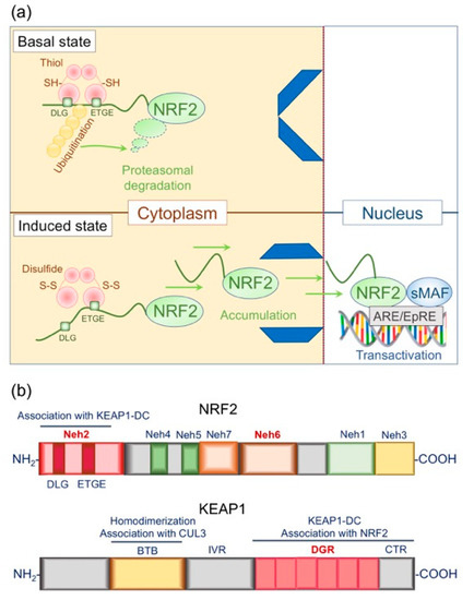 - McMahon, M.; Thomas, N.; Itoh, K.; Yamamoto, M.; Hayes, J.D. Redox-regulated turnover of Nrf2 is determined by at least two separate protein domains, the redox-sensitive Neh2 degron and the redox-insensitive Neh6 degron. J. Biol. Chem. 2004, 279, 31556–31567. [Google Scholar] [CrossRef]