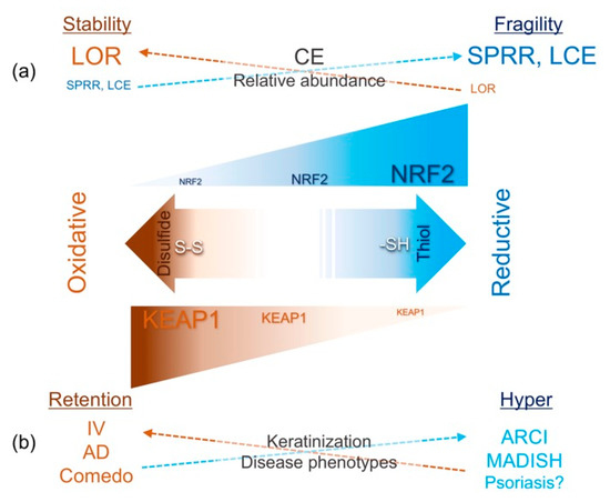 The KEAP1/NRF2 signaling pathway in keratinization and related skin diseases. (a) Phenotypes of the cornified cell envelope (CE). The oxidized status preferentially stabilizes the CE, and loricrin (LOR) promotes cytoskeletal cross-linkage. NRF2 repairs a defective barrier, probably in response to a perturbed redox balance, whereas persistent NRF2 activation hampers the formation of disulfide cross-linkage and makes the CE fragile. (b) Keratinization and disease phenotypes. An oxidative environment favors retention keratosis, which can lead to common dry skin conditions such as atopic dermatitis (AD) (clinically non-inflamed skin), or comedo (occluded hair follicle due to infundibular keratinization). On the other hand, strong and persistent NRF2 activation may be associated with autosomal recessive congenital ichthyosis (ARCI) or metabolizing acquired dioxin-induced skin hamartomas (MADISH).