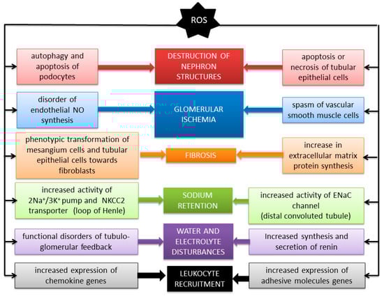 ROS directly affect individual components of the nephron, leading to the autophagy and apoptosis of podocytes, as well as to apoptosis (by activation of caspase 3 and 8) and necrosis (by activation of the PARP-1 polymerase) of renal tubular epithelial cells. At the same time, under oxidative stress, there is a phenotypic transformation toward fibroblasts in endothelial cells, mesangial cells, and renal tubular epithelial cells. It, together with the overexpression of the TGF-β receptor gene and increased collagen and fibronectin synthesis, leads to fibrosis of the renal parenchyma. Renal blood flow is disturbed as a result of vascular smooth muscle cell contraction and improper functioning of endothelial NO synthase. ROS also affect transport through ion channels in the renal tubules (NKCC2, ENaC), which leads to disturbances in the water and electrolyte balance in the body. Additionally, it is favored by the disruption of regulatory mechanisms such as tubuloglomerular feedback and the intrarenal RAA system. Oxidative stress also stimulates the secretion of chemokines (MCP-1, CSF-1) and the expression of adhesive molecules (ICAM-1), as a result of which an increased recruitment of neutrophils and monocytes/macrophages is observed, which are another source of ROS.
