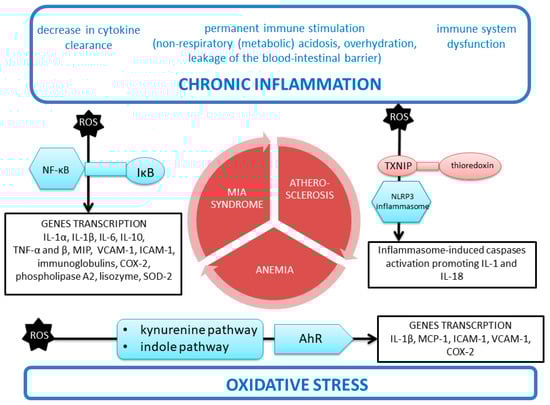The predominance of proinflammatory factors results from the malfunctioning of the immune system and constant immune stimulation, which is superimposed by the reduced renal clearance caused by the increasing loss of active nephrons [105]. Furthermore, the existence of the non-respiratory acidosis, and increased preload in the circulatory system, which is observed with a decrease in renal function, cause an increase in proinflammatory cytokine secretion [106]. In addition, overhydration causes swelling of the intestinal mucosa and an increase in blood–intestinal barrier permeability, which results in the penetration of bacterial toxins from the gastrointestinal tract into the circulation. All these factors appear in patients with diminished renal function, increasing the production of ROS by respiratory burst enzymes [105]. It should be noted that in patients with ESRD, the immune system is particularly affected. In this group of patients, (1) abnormal T helper (Th) lymphocyte maturation, (2) an increase in Th type 1 (Th1)/Th type 2 (Th2) cells ratio, and (3) B cell lymphocytopenia accompanied by (4) normal immunoglobulin levels, (5) disruption of antigen-presenting cells (APC) and an (6) upregulation of scavenging receptors (SR) on phagocytic cells have been disclosed [106].