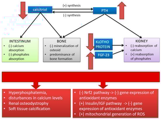 Generating reactive oxygen species (ROS) is necessary for both physiology and pathology. An imbalance between endogenous oxidants and antioxidants causes oxidative stress, contributing to vascular dysfunction. The ROS-induced activation of transcription factors and proinflammatory genes increases inflammation. This phenomenon is of crucial importance in patients with chronic kidney disease (CKD), because atherosclerosis is one of the critical factors of their cardiovascular disease (CVD) and increased mortality. The effect of ROS disrupts the excretory function of each section of the nephron. It prevents the maintenance of intra-systemic homeostasis and leads to the accumulation of metabolic products. Renal regulatory mechanisms, such as tubular glomerular feedback, myogenic reflex in the supplying arteriole, and the renin–angiotensin–aldosterone system, are also affected. It makes it impossible for the kidney to compensate for water–electrolyte and acid–base disturbances, which progress further in the mechanism of positive feedback, leading to a further intensification of oxidative stress. As a result, the progression of CKD is observed, with a spectrum of complications such as malnutrition, calcium phosphate abnormalities, atherosclerosis, and anemia. This review aimed to show the role of oxidative stress and inflammation in renal impairment, with a particular emphasis on its influence on the most common disturbances that accompany CKD.