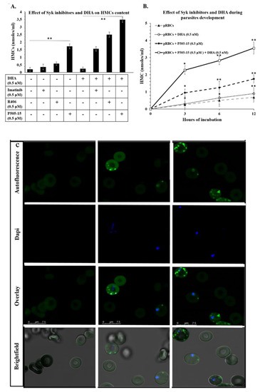 (A) Effect of parasitized red blood cell (pRBC) treatments with Syk inhibitors (imatinib, R406, and P505-15) (0.5 µM) and dihydroartemisinin (DHA) (0.5 nM) on the accumulation of HMC after 12 h of incubation. (B) Time course of hemichrome (HMC) accumulation contained in pRBCs treated with the representative Syk inhibitor, P505-15 (0.5 µM) and/or DHA (0.5 nM) for 3, 6, and 12 h. Data are the average of five independent experiments ± SD. Significant differences to untreated pRBCs at * p < 0.05; ** p < 0.001. (C) Confocal Images of HMCs contained in pRBCs untreated and treated for 12 h with P505-15 (0.5 µM). HMCs were visualized by their autofluorescence at 488 nm (excitation)/630–750 nm (emission). Images were acquired using the same magnification with a Leica TCS SP5 X (Leica Microsystems, Germany) confocal microscope equipped with a 60 × 1.4 numerical aperture oil immersion lens. The scale bar in the figure is 7.5 µm.