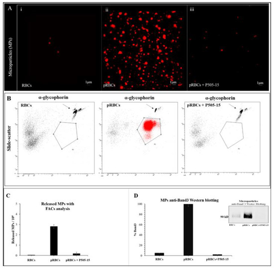 (A) Confocal Images of isolated microparticles (MPs) contained in pRBCs untreated and treated for 12 h with P505-15 (0.5 µM). MPs were visualized by their autofluorescence at 488 nm (excitation)/630–750 nm (emission). Images were acquired using the same magnification with a Leica TCS SP5 X (Leica Microsystems, Wetzlar, Germany) confocal microscope equipped with a 60 × 1.4 numerical aperture oil immersion lens. The scale bar in the figure is 1 µm. (B) Representative flow cytometric density plot of MPs in supernatant collected from RBCs, pRBCs, and P505-15-treated pRBCs. MPs were identified as glycophorin A-positive events (R1). The number of MPs was quantified using the known density of fluorescent trucountTM beads (arrows). (C) Graphical representation of flow cytometric density plot of MPs. (D) MP anti-band 3 Western blotting.