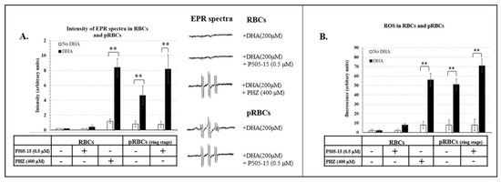 (A) Intensity of electron paramagnetic resonance (EPR) spectra (arbitrary units) in the presence of N-tert-butyl-α-phenylnitrone (PBN) spin trapping agent in RBCs treated with phenylhydrazine (PHZ) (400 µΜ) with/without DHA (200 µΜ). RBCs and pRBCs treated with/out P505-15 (0.5 μΜ) for 24 h with/without 10-min incubation of DHA (200 µΜ). (B) The same experiments mentioned above (A) were performed using the fluorescent probe 2′,7′-dichlorodihydrofluorescein diacetate (CM-H2DCFDA), a cell-permeable indicator of reactive oxygen species (ROS). Data are the average ± SD of five independent experiments. Significant differences between no-DHA RBCs and pRBCs at ** p < 0.001.