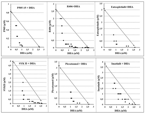 Isobolograms showing the interactions between Syk Inhibitors (P505-15, R406, entospletinib, SYK II, piceatannol, and imatinib) and dihydroartemisinin (DHA), after 24 h of incubation in the P. falciparum Palo Alto strain. Synchronized P. falciparum cultures were treated for 24 h with different concentrations (from 0.05 to 2.5 µM) of different Syk inhibitors (P505-15, R406, entospletinib, SYK II, piceatannol, and imatinib) in combination with different concentrations of DHA (from 0.6 to 10 nM) at the ring stage. IC50 concentrations of all the drug combinations were plotted in isobolograms to determine synergy, additivity, or antagonism.