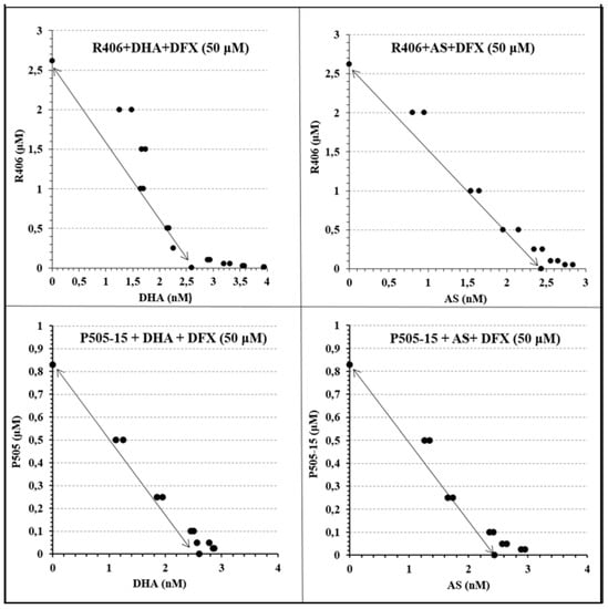 Isobolograms showing the interactions between Syk Inhibitors (P505-15 and R406) and dihydroartemisinin (DHA) and artesunate (AS) in combination with the iron chelator Deferasirox (DFX), after 24 h of incubation in the P. falciparum Palo Alto strain. Synchronized P. falciparum cultures were treated for 24 h with different concentrations (from 0.05 to 2.5 µM) of representative Syk inhibitors (P505-15 and R406) in combination with different concentrations of DHA and AS (from 0.6 to 10 nM) using a fixed concentration (50 µM) of the iron chelator Deferasirox (DFX) at the ring stage.