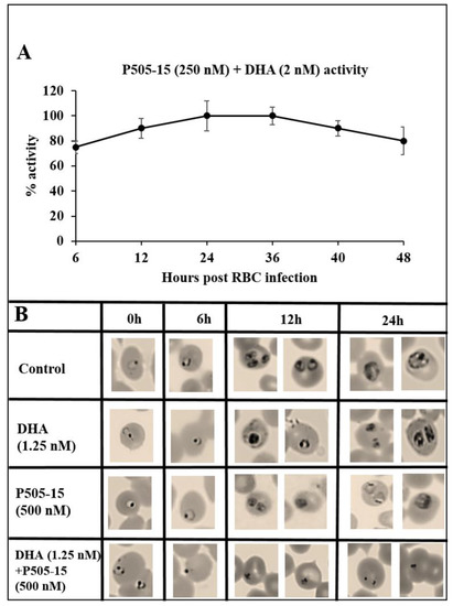 Finally, to determine whether the combined action of Syk inhibitor plus artemisinin on P. falciparum survival might depend on the stage of parasite maturation, we compared the effects of the combination therapy with each monotherapy at different stages of parasite development. Figure 7 shows that, upon adding DHA + P505-15 (2 nM + 250 nM) at different stages of parasite development, the maximal activity was observed between 12 and 36 h post infection corresponding to ring and trophozoite stages. The data in Figure 8B reveal that none of the drugs have a measurable impact on pRBC morphology at 6 h post infection, after which the monotherapies (i.e., DHA or Syk inhibitor alone) display detectable but comparatively mild effects (few pycnotic cells (less than 2%)) on pRBC morphology.