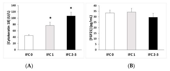 Figure 1. (A) Cytokeratin-18 and (B) fibroblast growth factor 21 (FGF21) plasma levels (mean ± SEM) according to the intrahepatic fat content (IFC). * p < 0.05 respect to IFC = 0 by a one-way ANOVA.