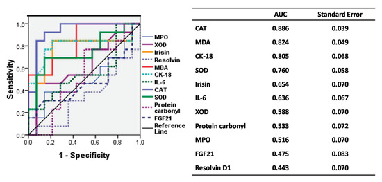 Finally, the current findings from the ROC curve and area under the curve, as well as the multivariate logistic regression, showed that the plasma levels of CAT, SOD, CK-18, irisin, IL-6 and MDA, as well as the inverse of resolvin D1 levels, may be good IFC markers useful in clinical practice.