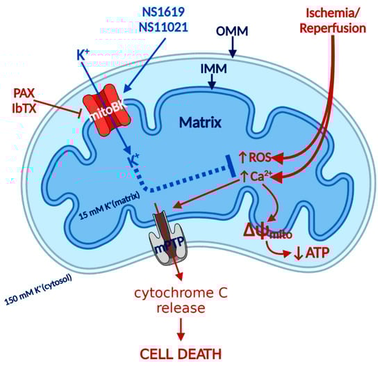 BKCa signaling in cardiomyocytes mitochondria during ischemia-reperfusion (I/R) injury. I/R injury causes an increase of reactive oxygen species (ROS) production and Ca2+ overload that leads to mPTP opening, the collapse of membrane potential (ΔΨIMM), and the release of cytochrome C that causes cell death. The opening of BKCa protects the heart by reducing ROS and increasing the calcium retention capacity, hence delaying the opening of mPTP. IMM—Inner mitochondria membrane, OMM—Outer mitochondria membrane. mitoBKCa activators (NS1619, NS11021), mitoBKCa inhibitors (PAX-paxilline, IbTX-iberiotoxin), mPTP-mitochondrial permeability transition pore.