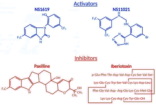 The ubiquitous BKCa expression, a dual activation mechanism that allows them to couple intracellular signaling to membrane potential and significantly modulate physiological responses in a plethora of tissues, prompted intense development of BKCa channel modulators [73,74]. The number of identified molecules is significant and growing, which is why we will limit this review to regularly used pharmacological tools (Figure 2) to study BKCa.