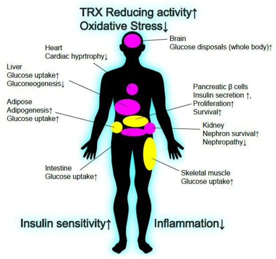| Brain (Obese/Diabetic) | Energy expenditure↑ Adipogenesis↓ Body Weight↑ Insulin resistance↑ | TRX/ROS | Hypothalamus:Body Weight↓ Insulin resistance↓ AgRP Neuron: Energy expenditure↓ Adipogenesis↓ | [103,104,105] | |
