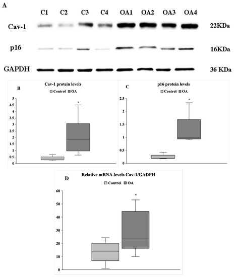 (A) Caveolin-1 levels are significantly higher in osteoarthritic (OA) than in control chondrocytes under normal conditions. Characteristic blot showing caveolin-1(Cav-1) and p16 levels in four control and four OA chondrocytes lysates. GAPDH was used as loading control. (B) Box blot demonstrating quantification of relative protein expression levels of caveolin-1 in cell lysates from 13 control and 17 OA patients samples was performed based on band density using Image J. (C) Box blot demonstrating quantification of relative protein expression levels of p16 in cell lysates from 13 control and 17 OA patients samples was performed based on band density using ImageJ. Values shown are the means ± S.E. * p < 0.05 vs. control. (D) Box blot demonstrating quantification of relative mRNA levels of caveolin-1 in control and OA chondrocytes. The horizontal lines inside the boxes denote the medians and the horizontal borders of the boxes the interval between 25th and 75th percentiles. The whiskers show the minimal and maximal values. Analysis was performed using chondrocytes from 13 healthy donors and 17 OA patients. * p < 0.05 vs. control. p values were calculated using the Mann–Whitney U test.