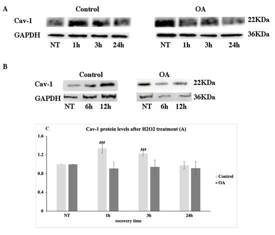 Caveolin-1 protein levels were also analysed in six control and six OA chondrocytes after being exposed to exogenous oxidative stress and left to recover for different lengths of time, as described in the Materials and Methods. It was observed that in the control cells, caveolin-1 protein levels were upregulated to statistically significant higher values at 1 and 3 h post-treatment compared to the non-treated (NT) condition and decreased back to basal levels after 24 h in recovery. In contrast, in OA chondrocytes, the levels of caveolin-1 did not show any differences between the NT condition and any time point post-treatment (Figure 2A,C).