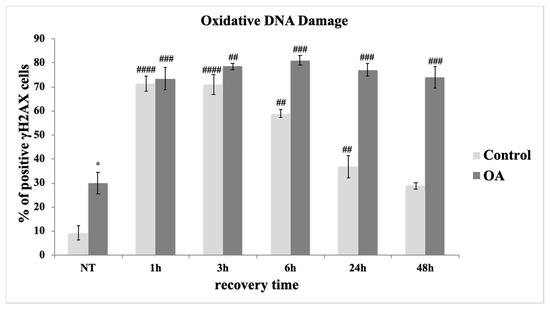 As mentioned earlier, exposure to H2O2 results in the formation of SSB, which could turn into DSB in subsequent rounds of DNA replication. In order to evaluate DSB formation in cultured chondrocytes from three control and three OA patients after being exposed to exogenous oxidative insult, the presence of the phosphorylated form (on Ser139) of histone variant H2AX (γH2AX) was microscopically analysed. As shown in Figure 3, a remarkable increase in γH2AΧ-labelled lesions was observed at 1 h and 3 h post-treatment with H2O2, which started to decrease after 6 h of recovery time in the control cells. A decrease back to almost basal levels of damage was observed 48 h after OS-treatment in the control cells. In contrast, chondrocytes of OA individuals exhibited a high rate of damage 1 h after treatment with H2O2, which remains high even after 48 h of recovery time, implying the inability of OA cells to repair this damage (Figure 3). This result reaffirmed our previously reported data on the DNA damage repair failure of OA cells [7] while also extending the range of time-points assessed.