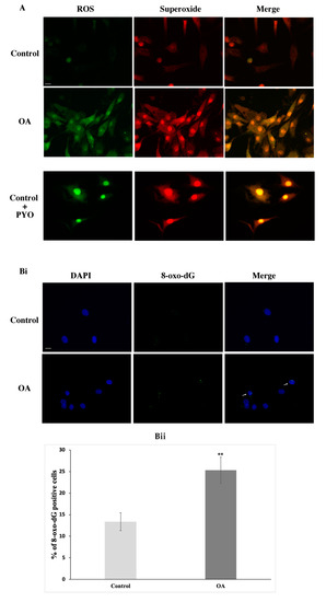 The osteoarthritic chondrocytes had elevated levels of oxidative stress even before the exposure to exogenous oxidative insult. (A) Characteristic images of control and OA chondrocytes (from three control and three OA patients samples, see method described in Materials and Methods) where total ROS and superoxide levels were analysed under normal conditions (Control-OA) and after pyocyanine was added to the control cells in order to serve as the positive control (Control + PYO). Images were captured with the 40× objective lens of the fluorescent microscope used. Scale bar 25 μm. (Bi) Oxidative DNA lesions were assessed by staining with 8-oxo-dG antibody and the appropriate secondary antibody (green). Nuclei bearing >5 foci stained with 8-oxo-dG were counted as positive. Nuclei were stained with DAPI (blue). Images were captured with the 40× objective lens of the fluorescent microscope used. Arrows point at nuclei having characteristic green foci indicative of the formation of 8-oxo-dG. Scale bar 25 μm. (Bii) Percentages of chondrocytes’ nuclei bearing 8-oxo-dG lesions from three control and three OA patients samples (Control-OA). Values shown are the means ± S.E. ** p < 0.01 vs. control cells. p values were calculated using the Student t-test. (C) Box blot demonstrating the quantification of relative mRNA levels of iNOS in the control and OA chondrocytes. The horizontal lines inside the boxes denote the medians and the horizontal borders of the boxes the interval between the 25th and 75th percentiles. The whiskers show the minimal and maximal values. Analysis was performed using chondrocytes from four healthy donors and four OA patients. * p < 0.05 vs. control. p values were calculated using the Mann–Whitney U test.