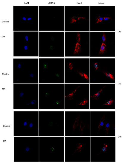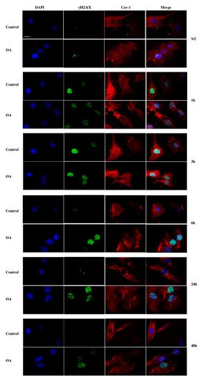 3.3. Microscopic Detection of γH2AΧ and Caveolin-1 Localization in Control and OA Chondrocytes after H2O2 Treatment