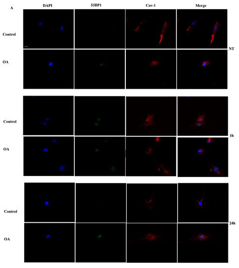 DSB after the exposure to H2O2 were also evaluated using the 53BP1 specific antibody since, as mentioned earlier, these DNA lesions promote the phosphorylation of 53BP1, that, together with γH2AΧ, signals the initiation of the repair of this damage [20]. Similarly, to γH2AΧ analysis, 53BP1 foci assessment confirmed the inability of OA cells to repair the damage even 24 h after exposure to the oxidative insult (Figure 7A,B). Once again, it was evident that caveolin-1 translocation in and out of the nucleus coincided with the appearance and resolution of 53BP1 foci in the control cells, whereas no such translocation took place in OA cells (Figure 7A).