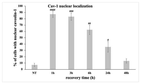 The percentage of control chondrocytes with nuclear caveolin-1 increased after oxidative insult and decreased back to basal levels for 48 h post-treatment. Percentages of control chondrocytes (three different control samples) with nuclear localization of caveolin-1 under normal conditions (No Treatment—NT) and at different time points of the recovery period from the oxidative treatment (1 h, 3 h, 6 h, 24 h, and 48 h). # p < 0.05, ## p < 0.01, and ### p < 0.001, #### p < 0.0001 vs. NT. p values were calculated using the Student t-test.