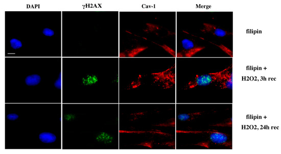 Filipin prevents caveolin-1 nuclear translocation. Characteristic images of caveolin-1 localization evaluated by anti-cav-1 antibody (red) in control chondrocytes treated with filipin for 24 h (filipin) before exposing cells to H2O2 and allowing them to recover for 3 h (filipin + H2O2, 3 h rec) and 24 h (filipin + H2O2, 24 h rec). DNA damage (γH2AX, green) was also assessed and nuclei were stained with DAPI (blue). Images were captured with the 100× oil immersion objectives of the fluorescent microscope used. Scale bar 25 μm.