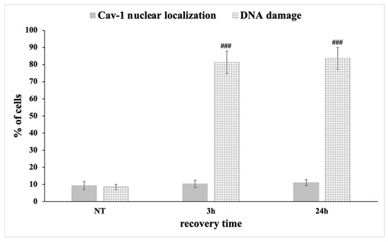 Prevention of caveolin-1 nuclear translocation inhibits DNA lesions restoration. Percentages of three different control chondrocytes pre-treated with filipin for 24 h with nuclear localization of caveolin-1 and DNA damage lesions (>5 foci stained with γH2AΧ) under normal conditions (No Treatment—NT) and at different time points of recovery from the oxidative treatment (3 h, 24 h). Values shown are the means ± S.E. ### p < 0.001 vs. NT. p values were calculated using the Student t-test.