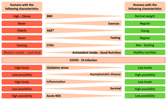 The pandemic of COVID-19 is of great concern to the scientific community. This mainly affects the elderly and people with underlying diseases. People with obesity are more likely to experience unpleasant disease symptoms and increased mortality. The severe oxidative environment that occurs in obesity due to chronic inflammation permits viral activation of further inflammation leading to severe lung disease. Lifestyle affects the levels of inflammation and oxidative stress. It has been shown that a careful diet rich in antioxidants, regular exercise, and fasting regimens, each and/or together, can reduce the levels of inflammation and oxidative stress and strengthen the immune system as they lead to weight loss and activate cellular antioxidant mechanisms and reduce oxidative damage. Thus, a lifestyle change based on the three pillars: antioxidants, exercise, and fasting could act as a proactive preventative measure against the adverse effects of COVID-19 by maintaining redox balance and well-functioning immunity. Moreover, because of the observed diversity in the expression of COVID-19 inflammation, the role of genetics of innate immune molecules, surfactant protein A (SP-A)1 and SP-A2, and their differential impact on the local lung microenvironment and host defense is reviewed as genetics may play a major role in the diverse expression of the disease.