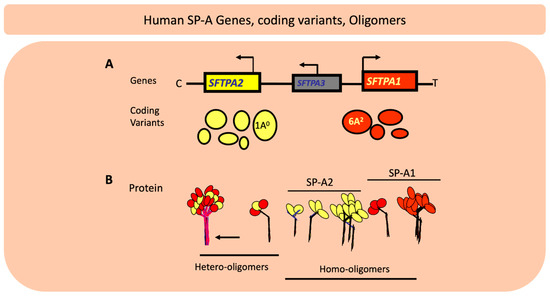 The chromosomal organization of SPFTPA locus consists of two functional genes the SFTPA2 encoding SP-A2 and the SFTPA1 encoding surfactant protein A (SP-A1) as well as a pseudogene, the SFTPA3 as shown in (A). The location of the centromere (C) and the telomere (T) are depicted. The transcriptional orientation is shown by a bent arrow. The two functional genes have opposite transcriptional orientation. The coding variants for each gene are shown below the relevant gene and the size of the circle denotes the frequency of each in the general population with the 1A0 and 6A2 being the most frequently observed variants. (B) depicts hetero-oligomers and homo-oligomers.