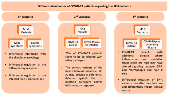 This Figure depicts three scenarios of the potential role of the SP-A innate immune molecules on COVID-19 patients, described in a recent editorial [149] and in part discussed in this review. In the first scenario, individuals with COVID-19 and no co-infection or other underlying disease may experience a differential disease expression from mild to severe based on the SP-A1/SP-A2 genotype. In the second scenario with a co-infecting pathogen, the SP-A genotype may provide a differential host defense against the co-pathogen and an overall differential outcome on COVID-19 patients. In the third scenario patients with underlying disease may experience alterations/dysregulation in inflammatory processes and oxidant levels in the lung. These changes in the lung microenvironment may differentially affect SP-A variant oxidation and thus lung function. In this case the clinical outcome in COVID-19 may vary in ways difficult to predict.